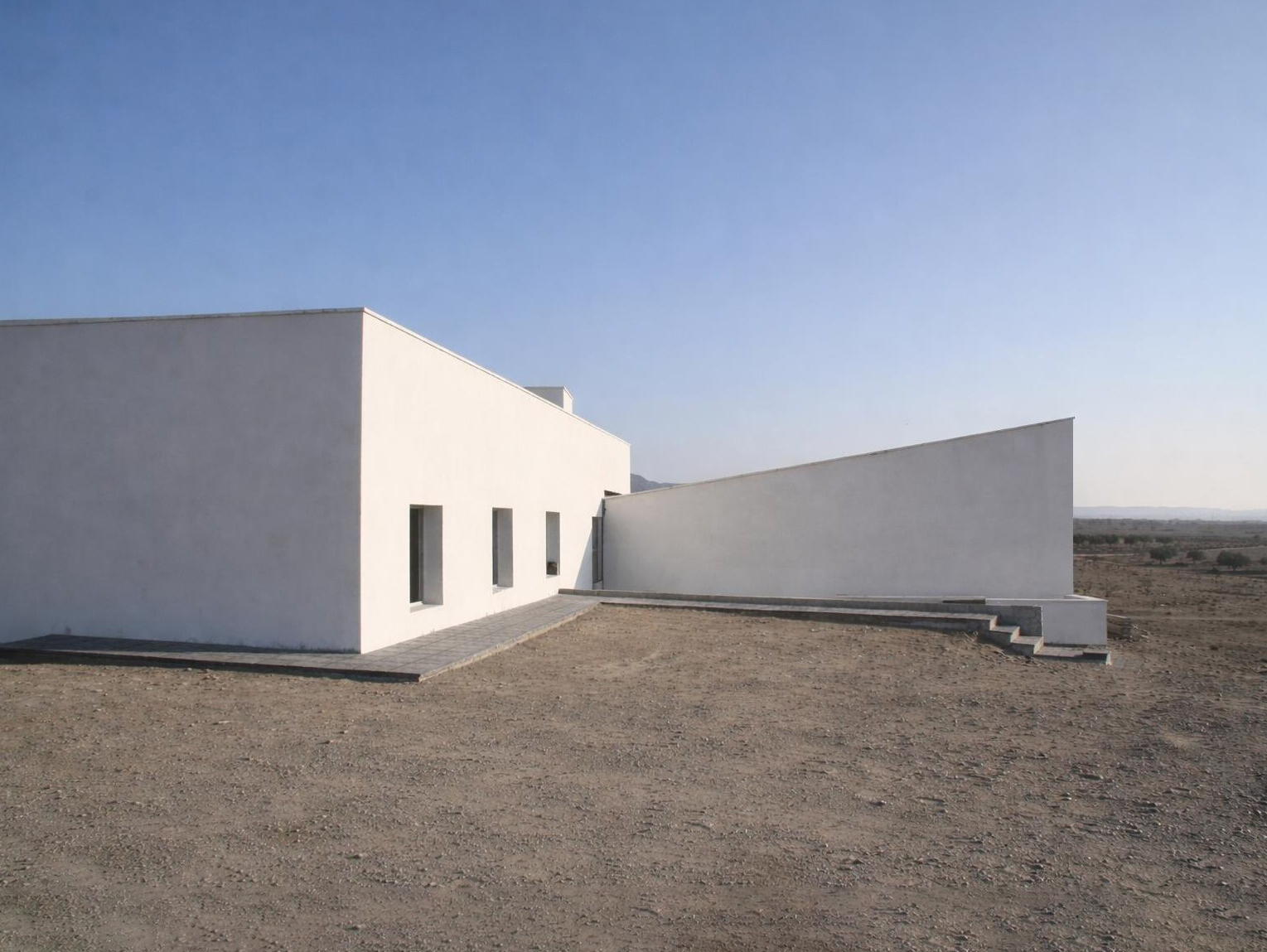 The complex is set within the desert landscape through white prismatic volumes of elemental geometry, clearly resting on the terrain. The architecture is conceived as an abstraction that emphasizes its relationship with the context, using material and chromatic continuity to integrate into the surroundings without competing with them.
