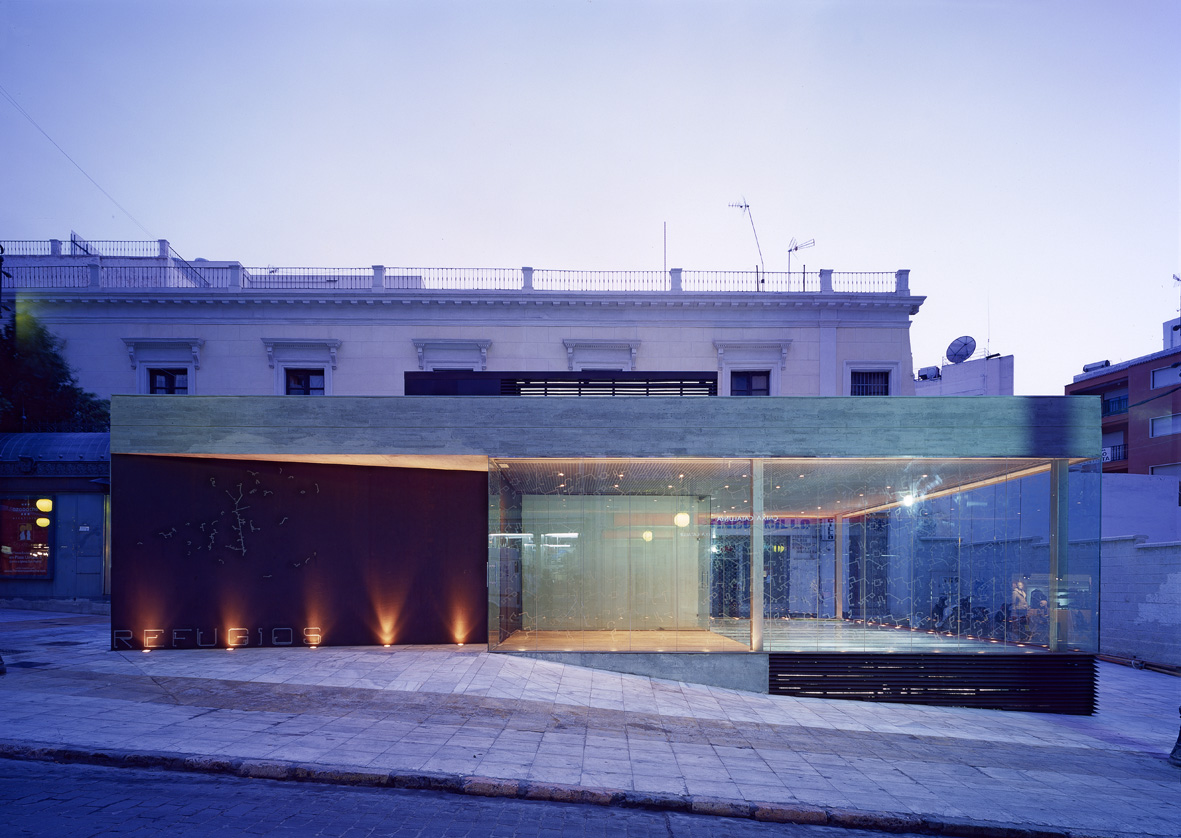 Por último, en la salida destacan dos elementos de geometría pura y elemental que alojan el ascensor y la escalera de forma independiente. Al salir de las galerías subterráneas se percibe la luz a través de los propios refugios grabados en el vidrio. De esta forma las piezas proyectadas se convierten en una alegoría de los propios refugios a través de los cuales se alcanza la luz del día, la luz de la vida. En definitiva, toda la actuación está plagada de guiños al lugar en un intento de vincular la actuación al contexto físico y cultural, dentro del máximo respeto a lo existente y del más estricto rigor.