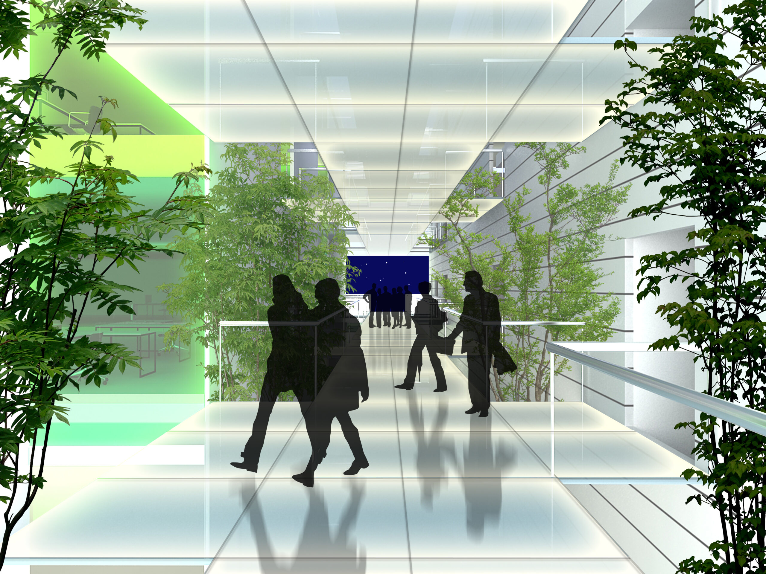 Existe una banda principal de comunicaciones que representa la columna vertebral de la propuesta formalizada como un espacio acristalado con vegetación ascendente y patios desplazados que provocan interesantes secuencias al visitante/usuario. Este distribuidor lineal se eleva sobre la cubierta, apareciendo como una linterna que actúa como reclamo desde el exterior. Desde el interior buscamos las miradas enfatizadas con piezas que cruzan el edificio transversalmente. Cada planta presenta una sala de reuniones que se asoma al paisaje buscando las vistas de la bahía y del Cabo de Gata.